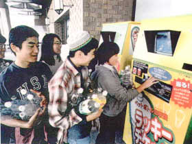 ■ラッキーチケット付き空き缶回収機って何? 空き缶を機械に投入すると圧縮機が働き缶を平らに潰すと同時に、モニター画面 のサッカーPKゲームが始動し、 当たりが出ると商店街の協賛店による各種ラッキーチケットがその場で発行されるという機械。 このシステムの発祥の地は東京の早稲田商店街エコステーションである ■ラッキーチケットにはどんな物があるの? チケットは、城見町通りの各協賛店と会社・団体等の提供による物で、中身はおもに、値引き券、 1品プレゼント券(ドリンク等)、粗品進 呈券などで構成され、中には映画鑑賞券やCDギフト券、 全商品半額券などの豪華賞品も ■集まった缶はどうするのですか? 特定の産業廃棄物処理業者に依頼し責任をもって処理しています。 |