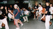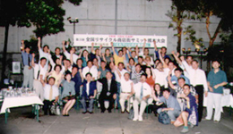 パビリオンに移して実は今回のメインイベントだったりする「夜のサミット」こと懇親会の開始です。暑さの余韻の残る、吹き抜けの中庭で冷えたビールが心地よく喉に染みいります。熊本大会実行委員長南氏の開会の音頭ともに、熊本ジャンベクラブによるアフリカ太鼓のアトラクションが始まります。南国熊本の熱い鼓動が太鼓のリズムに乗って伝わってきます。懇親会は立食形式でおこなわれ、会場のあちこちに話の輪ができて盛り上がっていきます。毎年9月に行われる熊本秋の大祭での勢子隊も乱入(?)し、宴は最高潮。参加者の笑顔に、今日という日が、全国の様々な商店街の、新しい未来に向けての一歩になったことを確信し、熊本大会が無事成功を収めることが出来たことを感謝するばかりでした。 |